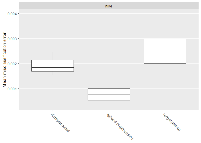 I compare the performance of three different learners: a random forest, XGBoost (a gradient boosting algorithm), and a ranger (a fast implementation of random forests). Each learner’s hyperparameters are tuned in the cross-validation process. For preprocessing, I center and scale the features. Here are the leaners’ instantiations: